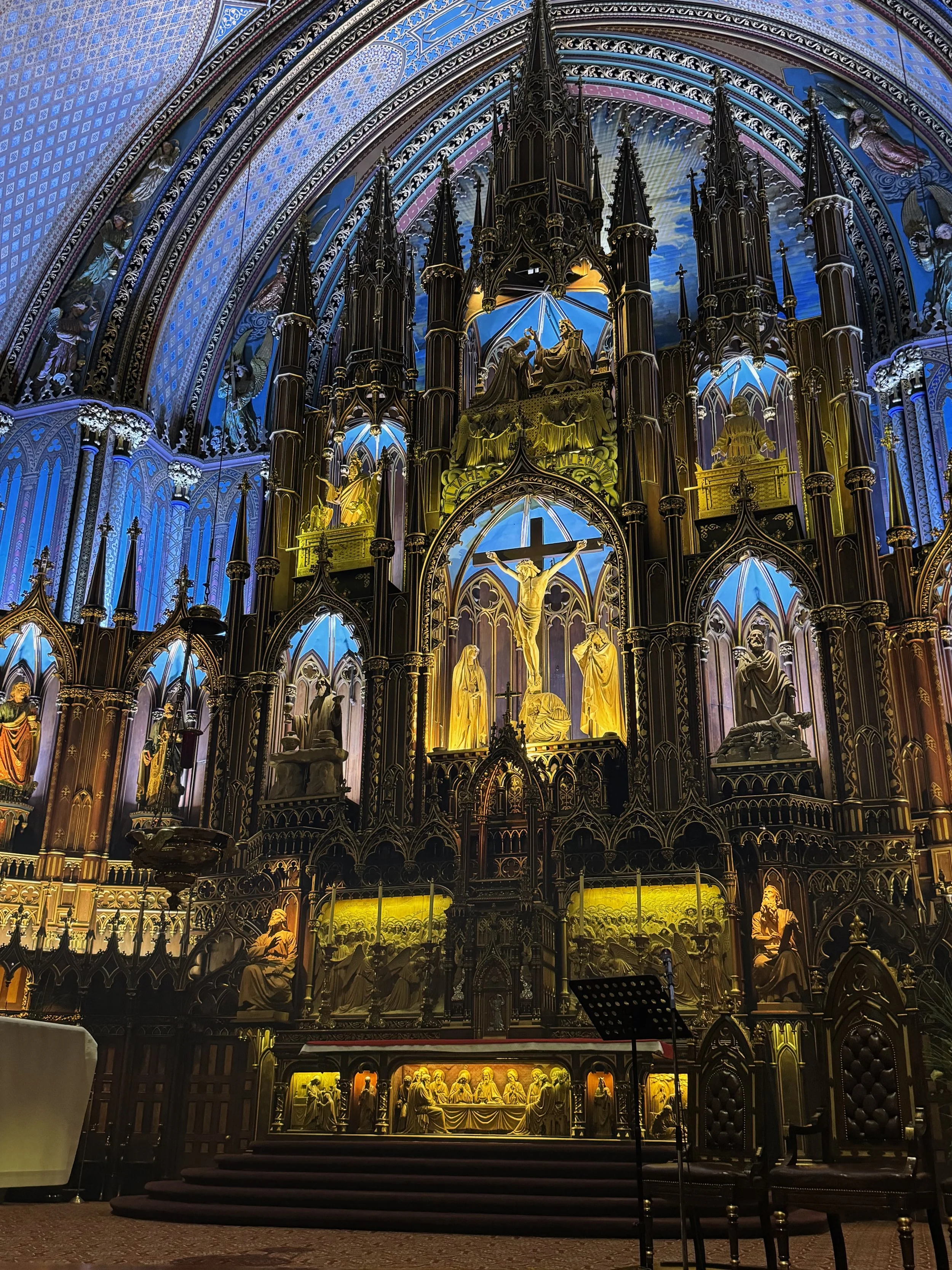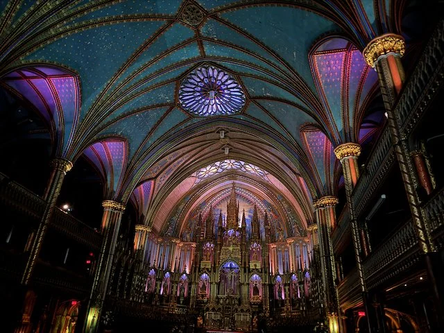 Notre Dame Basilica: A beautiful example of gothic revival architecture known for the blue accents in the sanctuary, stained glass, and nighttime lights show.