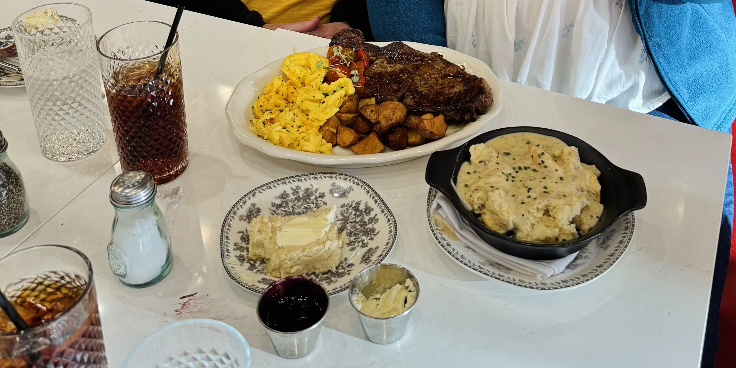Pioneer Woman Mercantile - Serving breakfast lunch and dinner with favorites such as homemade biscuits, chicken fried steak, ribeye steaks, sandwiches and more. Enjoy the fresh biscuits served with each meal. Additionally, admire the variety of Pioneer Woman cookware while you are eating. Coffee, tea, and hot chocolate is served in her floral mugs as an additional bonus.